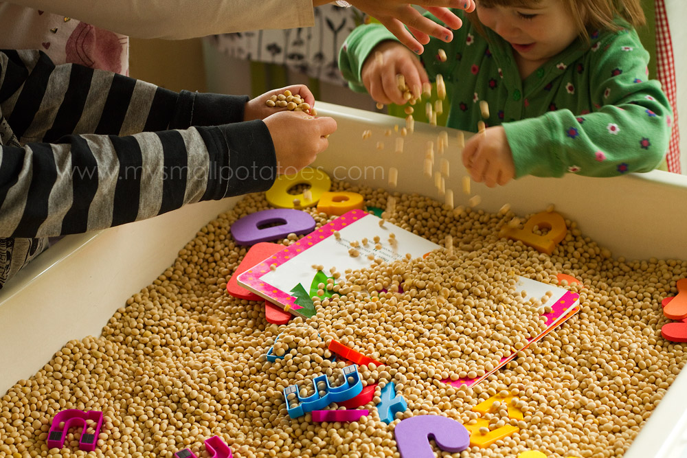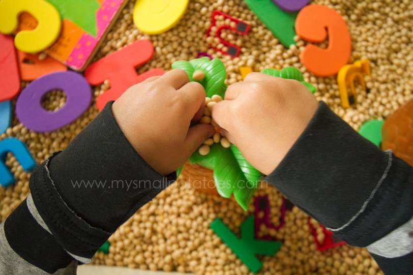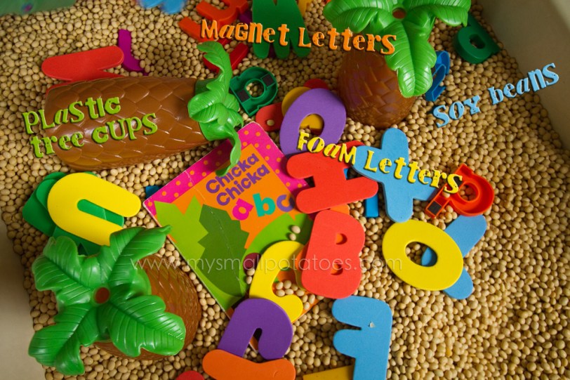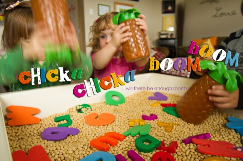 We added foam and magnetic letters to soybeans. I had found the coconut tree cups at the dollar store a while back, so that was lucky! We also put the board book in with it all. And it was such fun! They made it rain all over the book as they chanted “CHICKA CHICKA BOOM BOOM!!