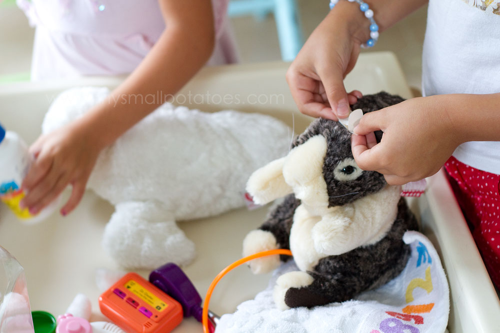 The little animal doctors spent the better part of an hour caring for, snuggling, bandaging, and medicating all our stuffed animals…