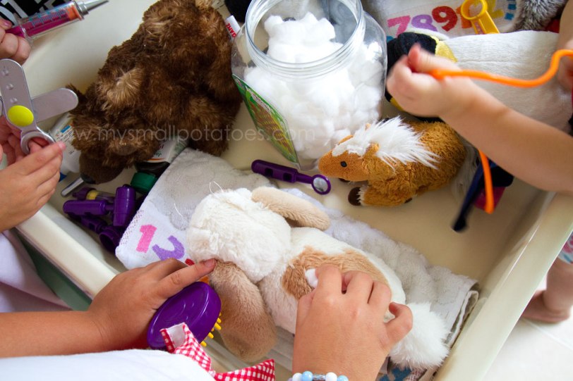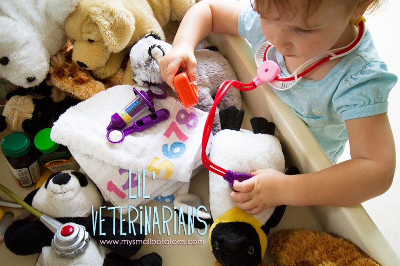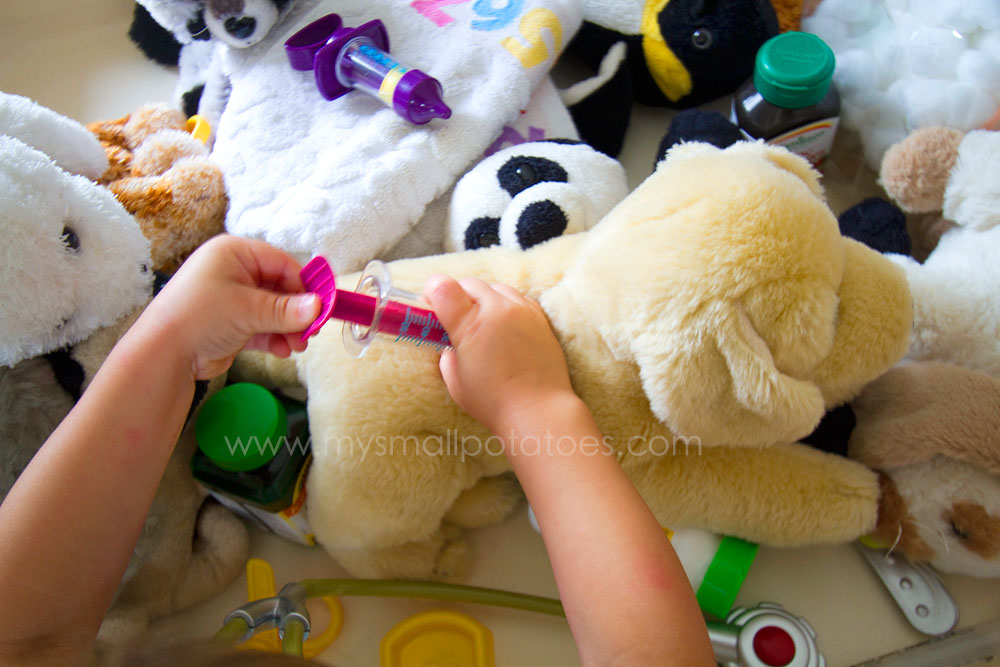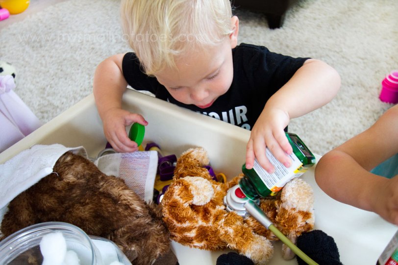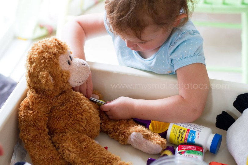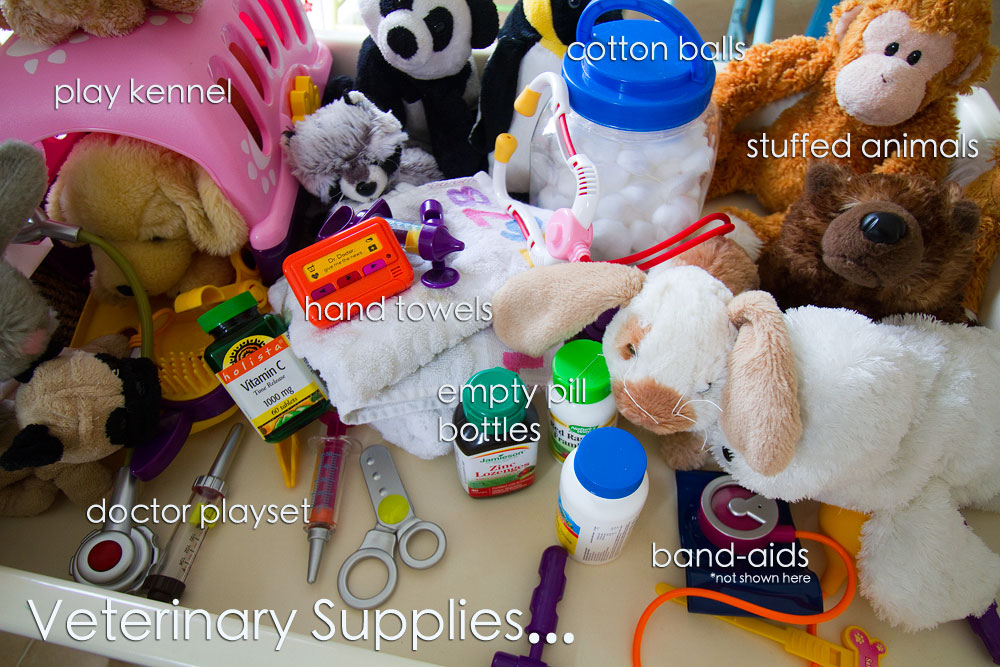 I gathered what I thought we would need to set up our own veterinary clinic. We used our sensory table so the bits and bobs wouldn’t find their way to the floor so easily…