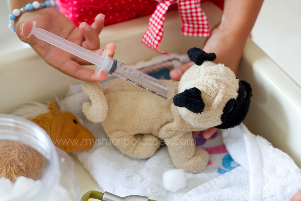 And the wee doctors went right to work. Their imaginations went into high gear and soon our little clinic was buzzing with activity. They’re was so much to be done! Little pug needed his vaccinations…