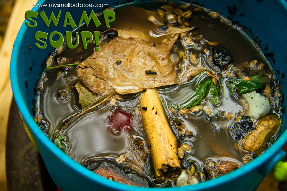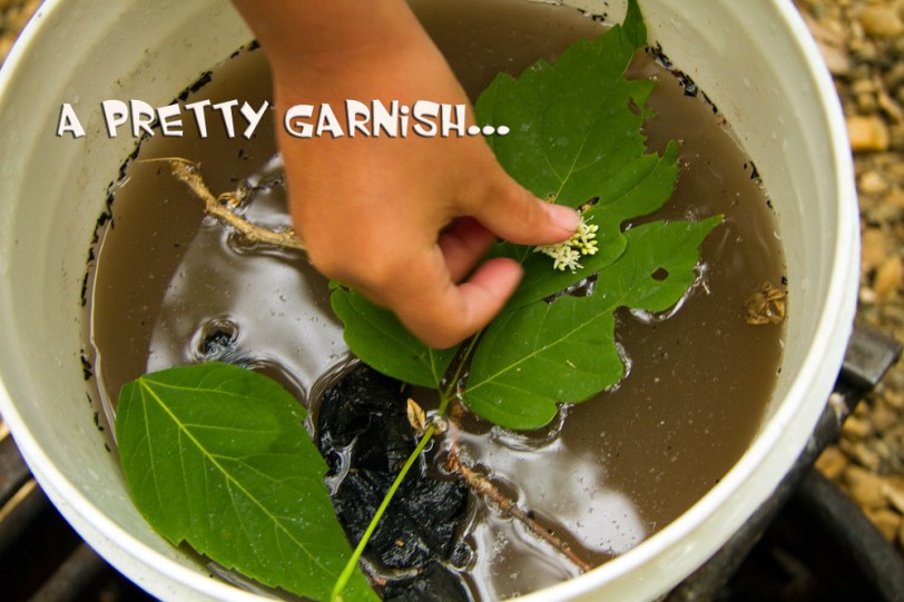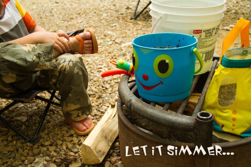 Three of my kids were bored. When my kids say they’re bored, they get put to work. Seriously. I give them a job or a chore to do. It really cuts down on the number of times you hear the phrase, “I’m bored!” This time however, I was feeling merciful. It was vacation after all! So I gave them a really fun job. They got to cook dinner too! I gave them each a bucket of water and a scoop and instructions to use ingredients to make a soup that came only from nature…things they found around the campsite.