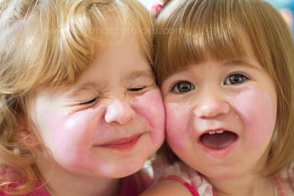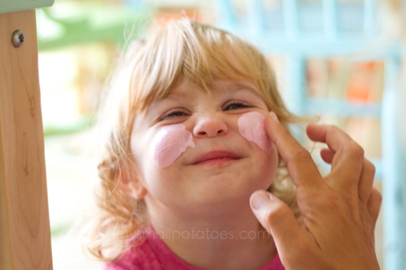 The girls kept saying to me that they wanted to be pink just like Pinkalicious. I had no face paint on hand, but I quickly came up with a solution. I used baby Zincofax cream and mixed it up with a few drops of red food colouring. I applied it only on their chubby cheeks. It did not stain their skin, or mine! They loved it!!