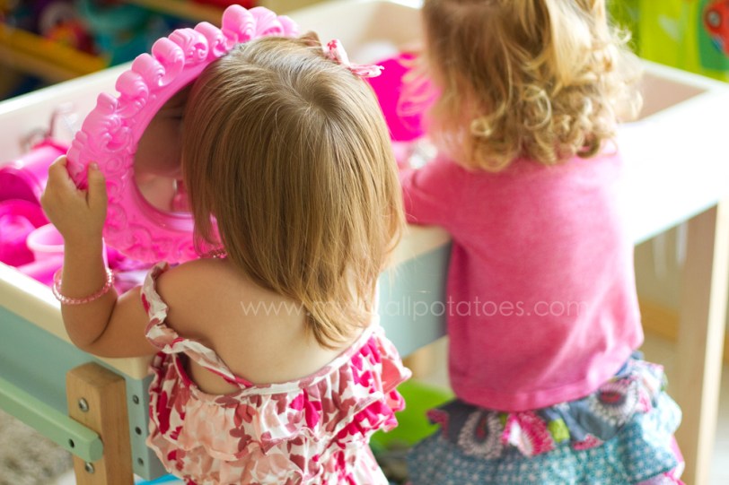 The most popular element of the sensory table, was the mirror, purchased at the dollar store for $1.50. The girls loved making faces at themselves and oh, the giggles that ensued!