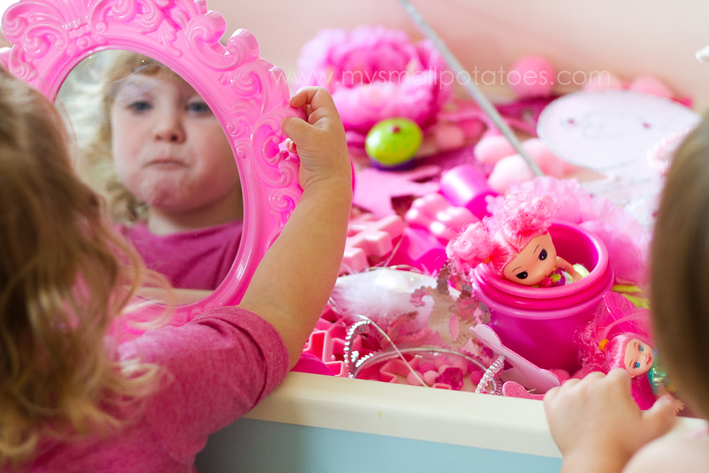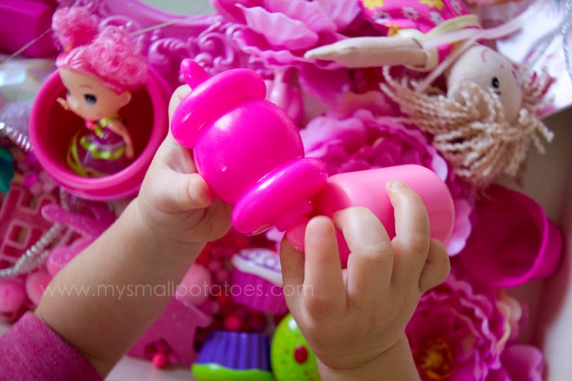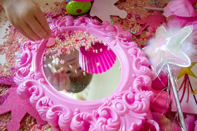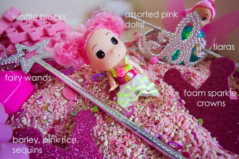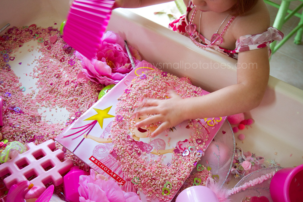 Yes! I colored the rice myself! It’s from our valentines bin…we like to reuse and recycle!! The only thing we had to buy for this party were the peonies, the dolls with pink hair, and the mirror! Bean did a good job of scavenging for pink!