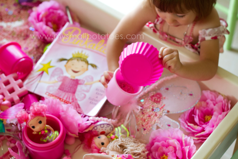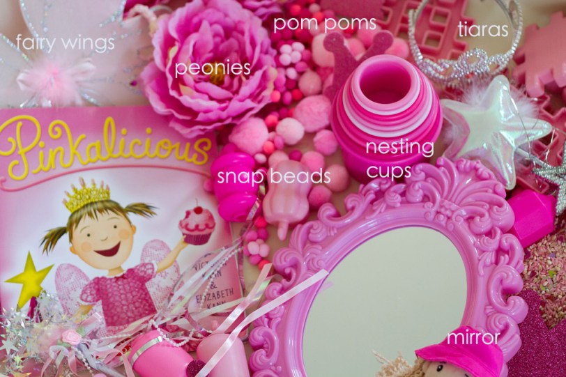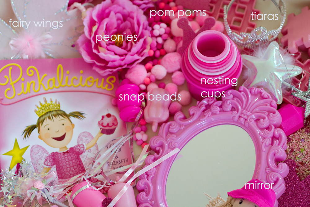 First of all, I have to begin with telling you that this post was mostly created by my 12-year-old daughter, Bean. She has been reading my blog lately and was inspired to contribute. I told her that Pinkalicious was next up on the roster, as we have had 2 little girls during the day who LOVE this story. I gave Bean the book and asked her to create a sensory activity for the 2 toddlers in our group. She made lists, she gathered from our supplies, and I took her to the dollar store for the rest. This is what she created…
