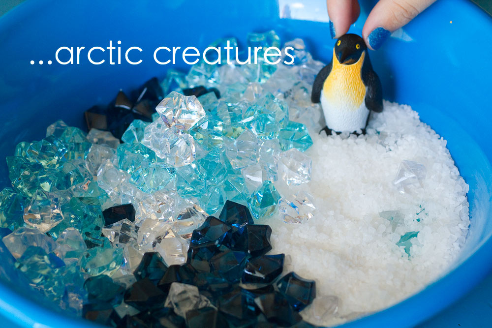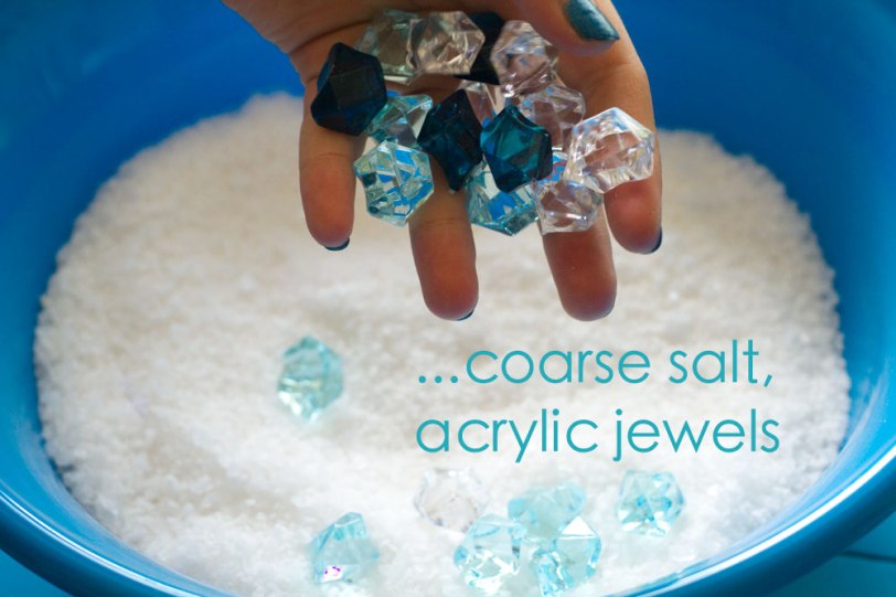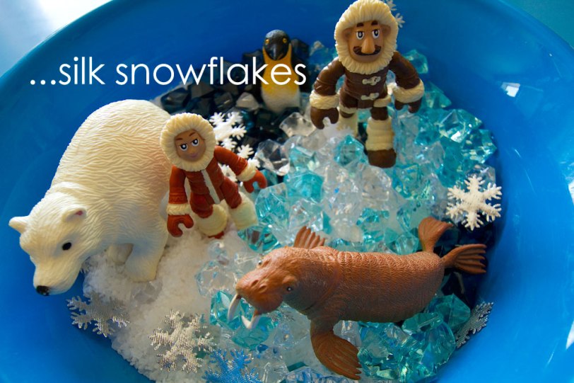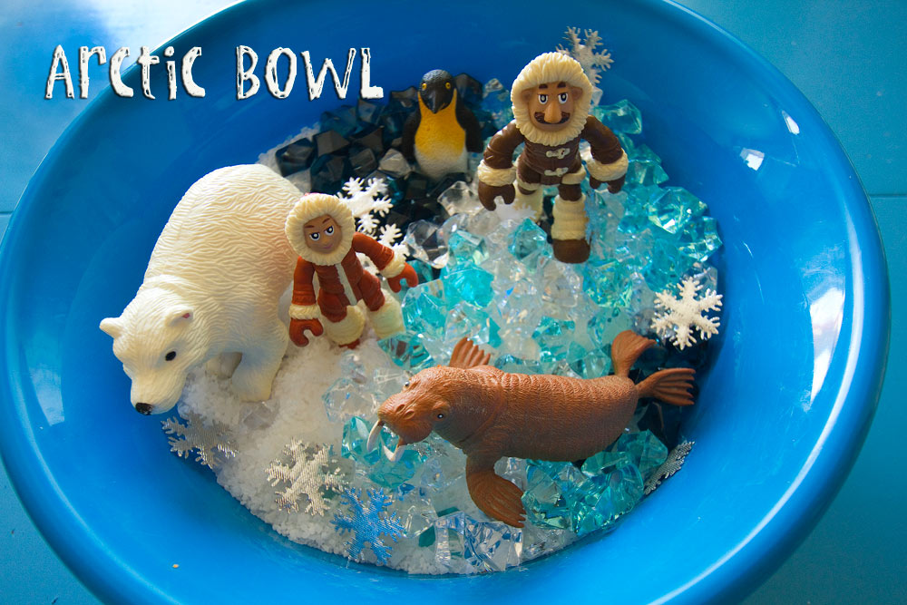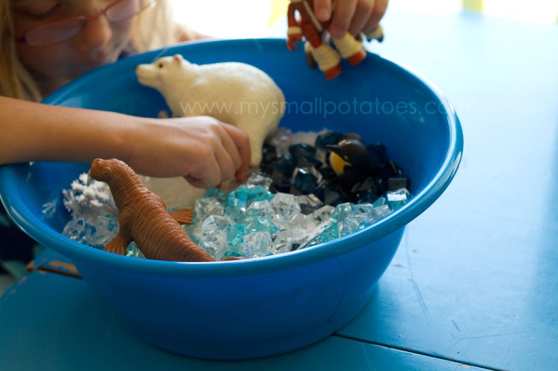 Our next bowl is the Arctic Bowl. It is very simple to assemble…We have an arctic play set in our toy shelf, so I borrowed some of the creatures from the bin. The toy set originally came from Toys R Us…The acrylic jewels and snowflakes came from the dollar store. My son really likes the arctic bowl…he got it all set up the way he liked it and said,