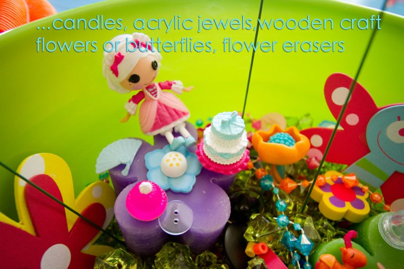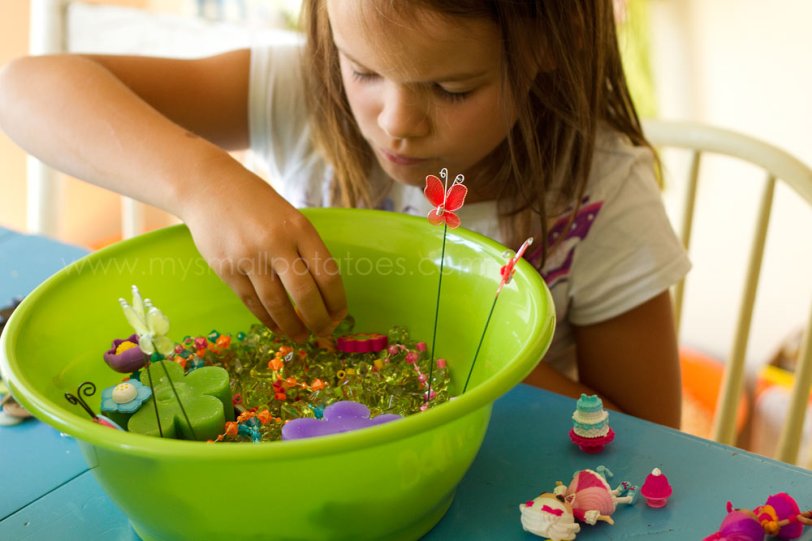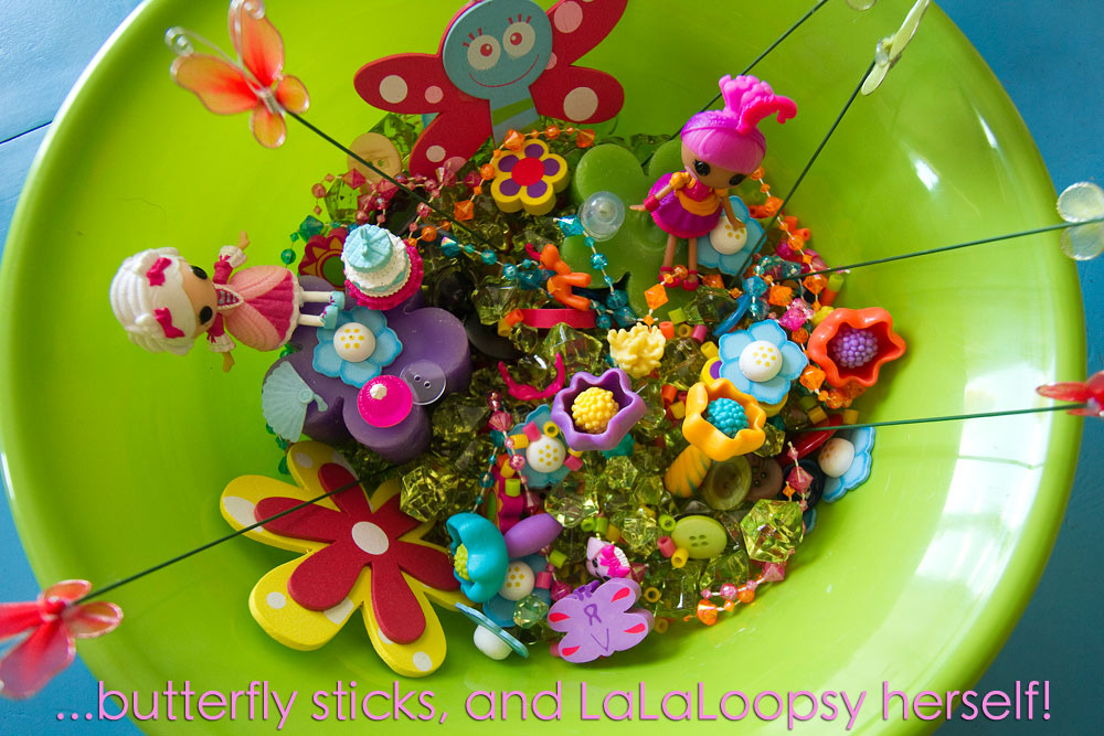 We’ll start with our LaLaLoopsy Bowl…LaLaLoopsy dolls are the latest fad around here with the girls. They are cute little colourful dolls with button eyes and deliciously girly names. They lend themselves to a sensory activity so easily! Liz had the most fun putting this one together. A lot of the pieces in this bowl came from our craft supplies, or the dollar store. The bead necklaces were cut into 3 inch sections, and the candles had their wicks removed. Your imagination is the limit, but here is a photo guide of the elements we used in the bowl…And then the playing began. Coco likes to remove things from sensory activities and organize them the way she likes. I tell the smalls it’s ok to remove items and play beside and inside the bowl, they just can’t wander off with pieces and bits. As you can imagine, this bowl was popular with the girls, and they had a hard time waiting for their turn!