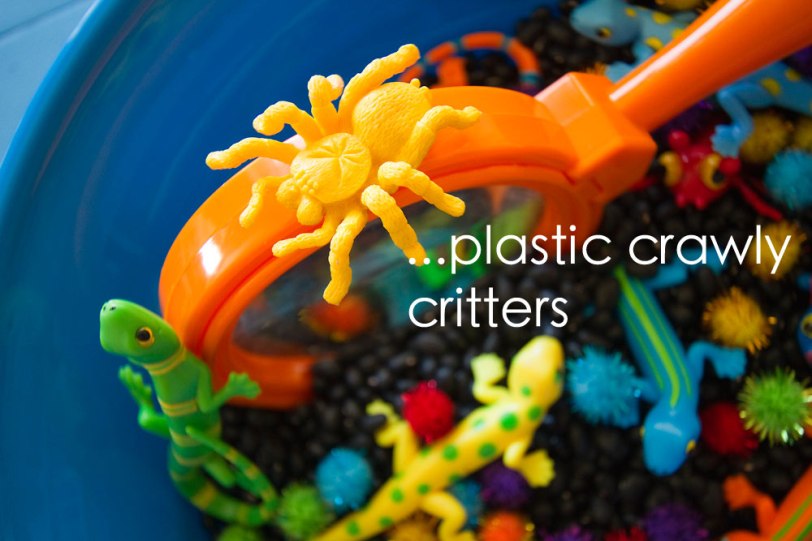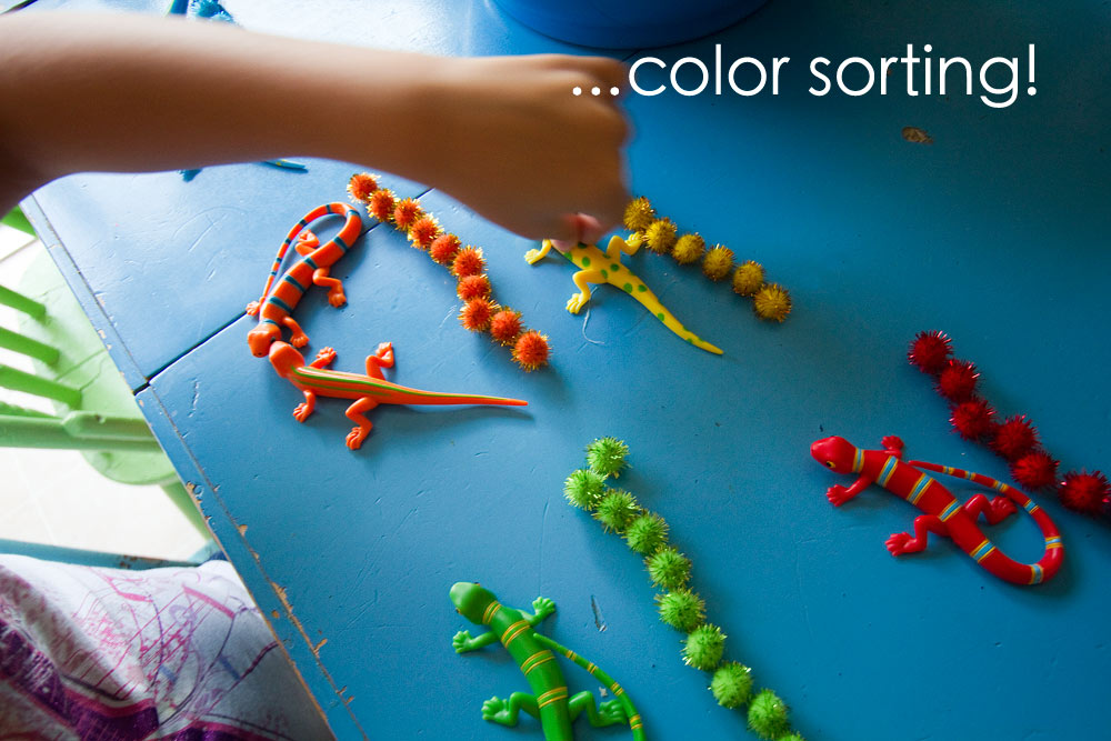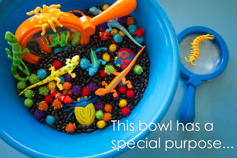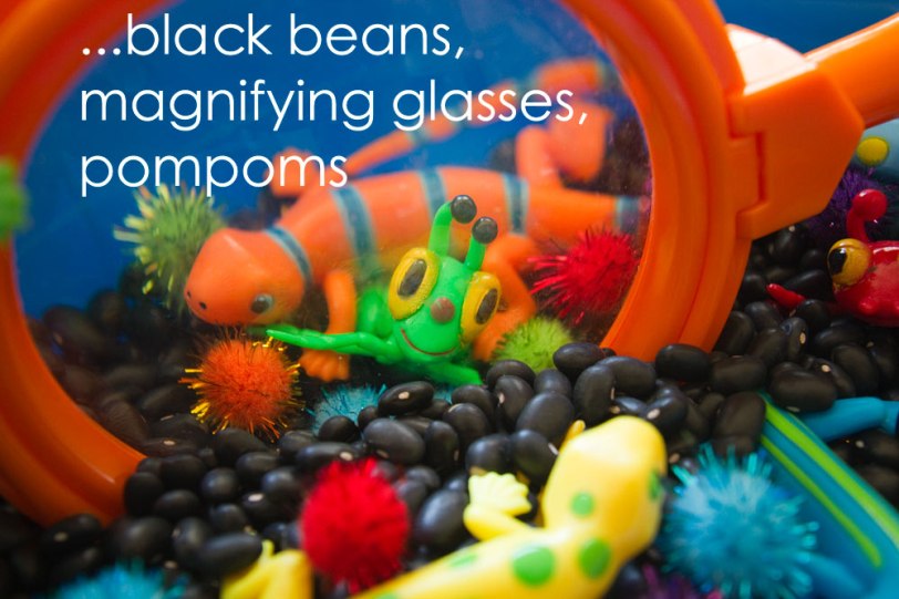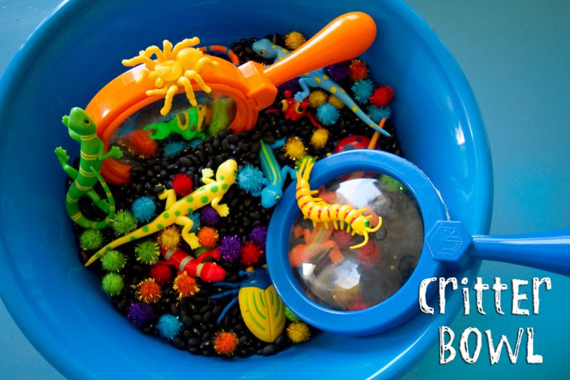 And for our last bowl today, we created the Critter Bowl…It is chock full of colour and creepy crawly critters and is a big hit with the toddlers AND big kids alike. It’s very simple to assemble…And that’s it! The smalls scooped and burrowed, they looked at the critters with the magnifying glasses. But that’s not all you can do with this bowl…And not only color sorting, but counting, too! Coco liked to count how many pom poms she needed to match the length of the lizards. What a great way to introduce children to the concept of measuring!