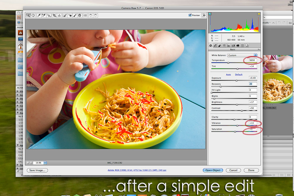 Now, what happens if you make all your photographs on an AWB setting, you upload them to your computer, and you are unhappy with them? Well, a lot of the warmth can be added in when you are editing. Most editing programs will allow a change in temperature, vibrance, and saturation. I use Photoshop CS4, but most of my editing is finished in Adobe Camera Raw.