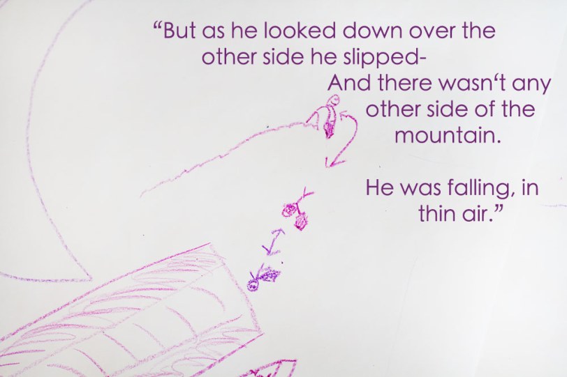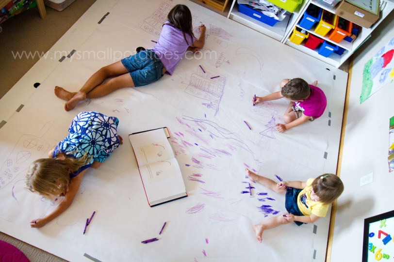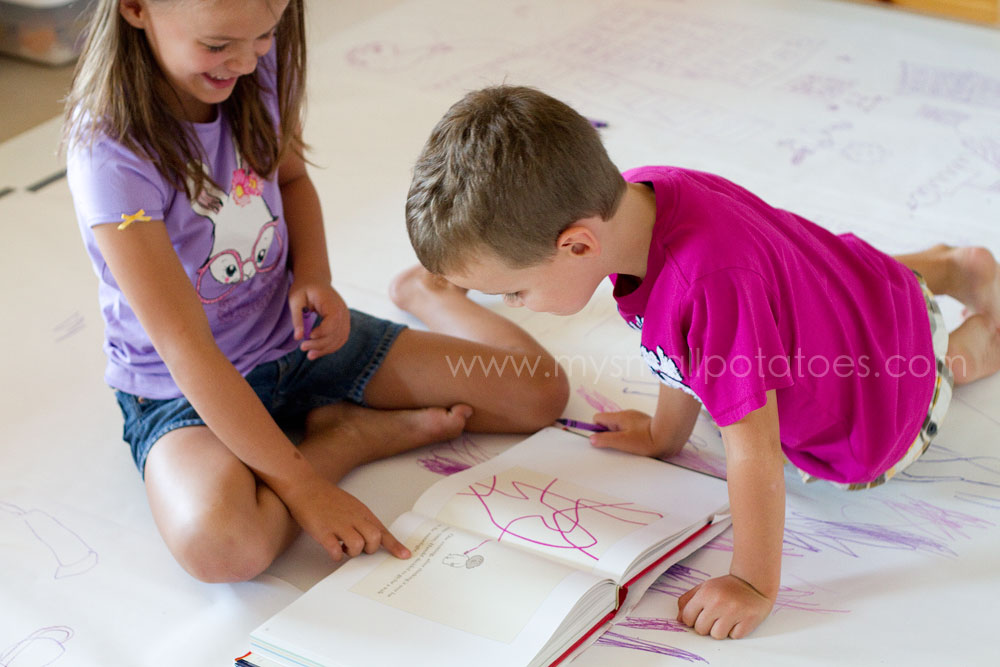 The whole afternoon was spent drawing on the art room floor. The smalls would come back to the book every once in a while to see if they’d forgotten anything…