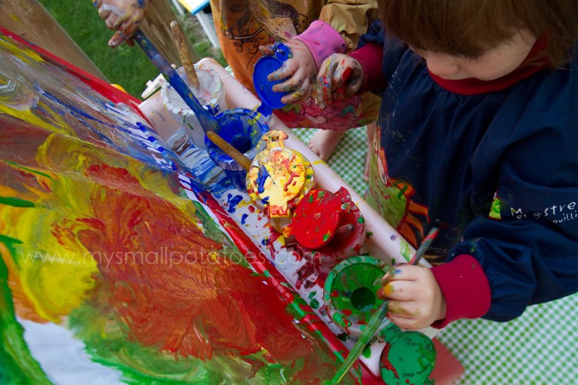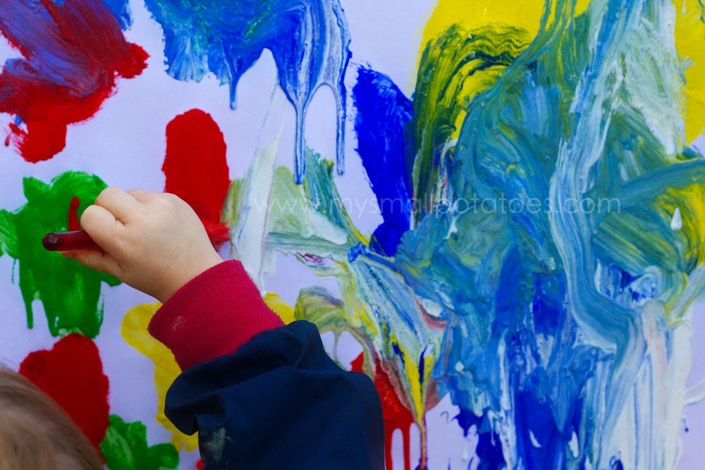 By having free reign of more than one paint colour, the small child learns that by mixing two or more colours together , she can create a new one! It’s like magic, but it is also the beginning of learning colour theory.