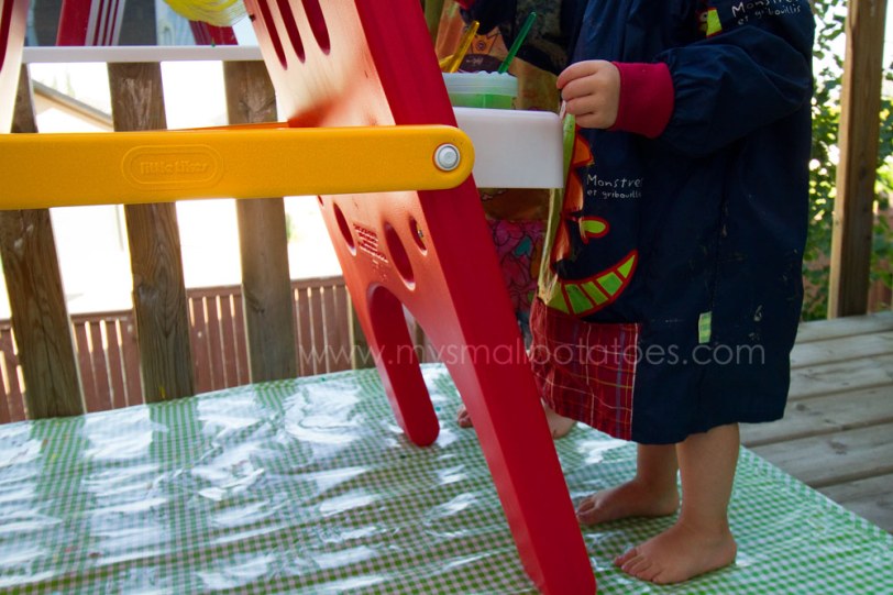 We found an easel at a yard sale for $5 this summer and have loved having it on our deck. I love that my 22 month old can paint and I don’t have to worry about the mess.