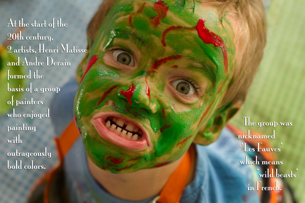 First of all, what is a “Fauve“? Well, I’m pretty sure this next image will sum it up for you!When I was studying up of Henri, I realized how perfect Fauvism fit in with every day preschool, toddler art work. Painting is a full sensory activity for them.  They don’t stick to painting things the way the world thinks they should. Young children paint things the way they FEEL they should be painted.After I realized I had a group of Fauves right under my roof every day, I thought about how best to relate this concept to them. How could I create an activity where the smalls could express themselves without a lot of structure? I cold have just given them each a colouring book page and asked them to paint it how they felt it should be. But that seemed to structured. Too forced. Then I had an idea.