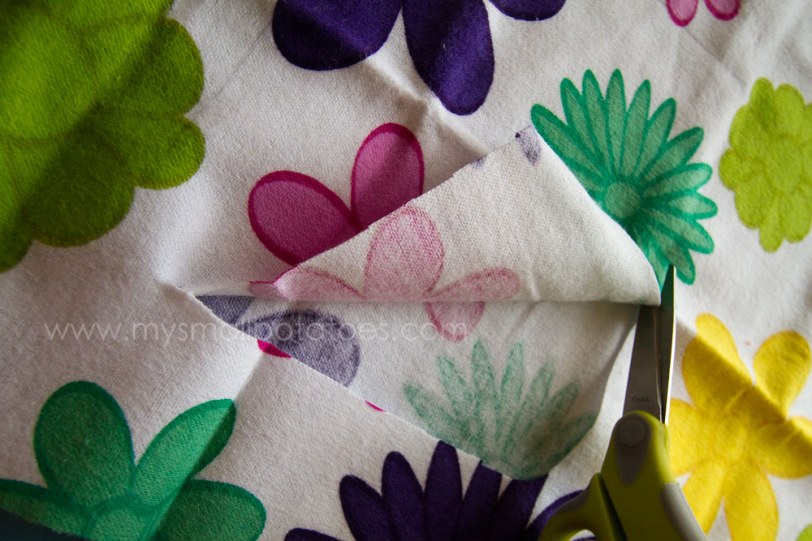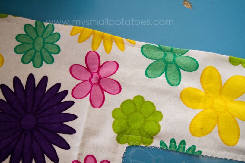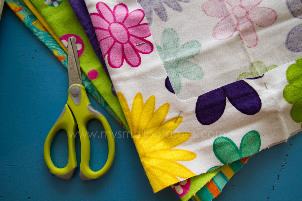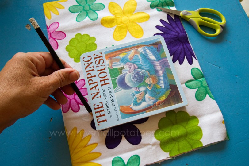 I used flannel pieces that come in a bundle at Walmart. They are cute, soft, and inexpensive. I can make 5 bags with one bundle and the bundle was under $12.  I folded one piece in half and trimmed off a few inches on the top. But really, the size of your busy bags it’s entirely up to you.