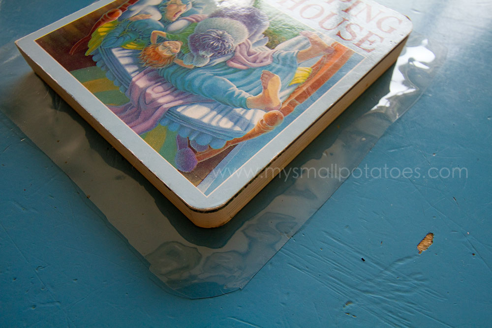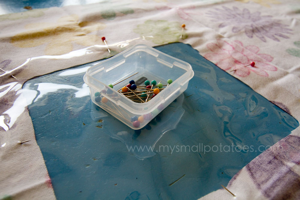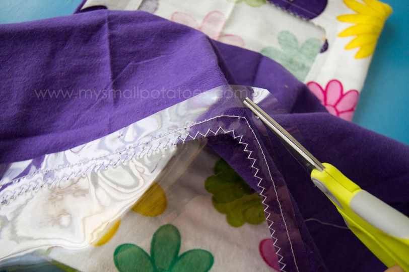 Once I had the bag the size I wanted, I used a board book to trace a window on the front of the bag. I warned you this was a hack job, didn’t I?I simply placed the book where I wanted the window, and traced around it with a pencil, removed the book, and started cutting. Just remember to ONLY cut the top layer of your bag…For the window, I used plastic tablecloth sheeting I found at Jysk for $3.99/metre. I used the same stellar measuring technique as I did on the front of the bag…I simply placed the book on the plastic, and cut out around it about an inch and a half from the edge of the book. Mum, if you’re reading this, I’m sorry…you did teach me to know better!! (But it worked!)
