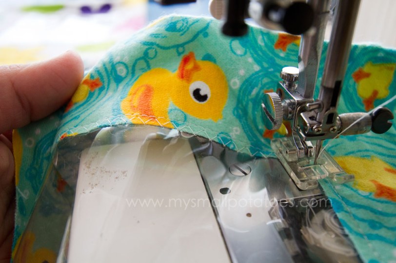 Once you are finished your cutting and pinning, sew a straight stitch around the edge. I kept the inside edge of the window, right on the outside edge of my machine’s pressure foot to keep me in a straight line.