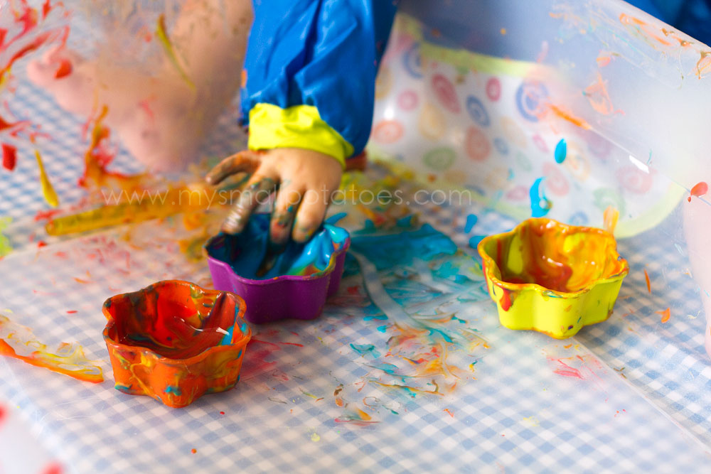 Baby J picked up the cups, dumped them out, swirled the paint around with the brushes and or his fingers. All the while, not being hindered by a grown-up trying to contain the mess. It was already contained inside the tub.Did he put the brushes in his mouth? You bet he did…But because I left the soap out of the recipe (most finger paint recipes add dish soap for easy clean-up), he was perfectly safe, and perfectly happy.Remember, babies will not always keep their hands inside the bin. They don’t understand this rule. So there shouldn’t even be one. I use a splash mat under the babies so they can paint “outside the lines.” It’s also a good idea to have them in a diaper only so they aren’t painting on their trousers.
