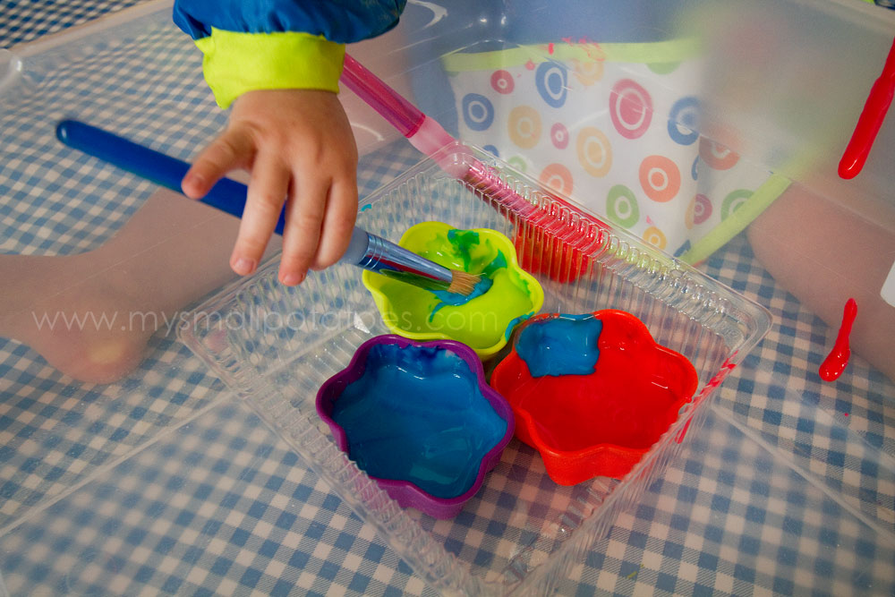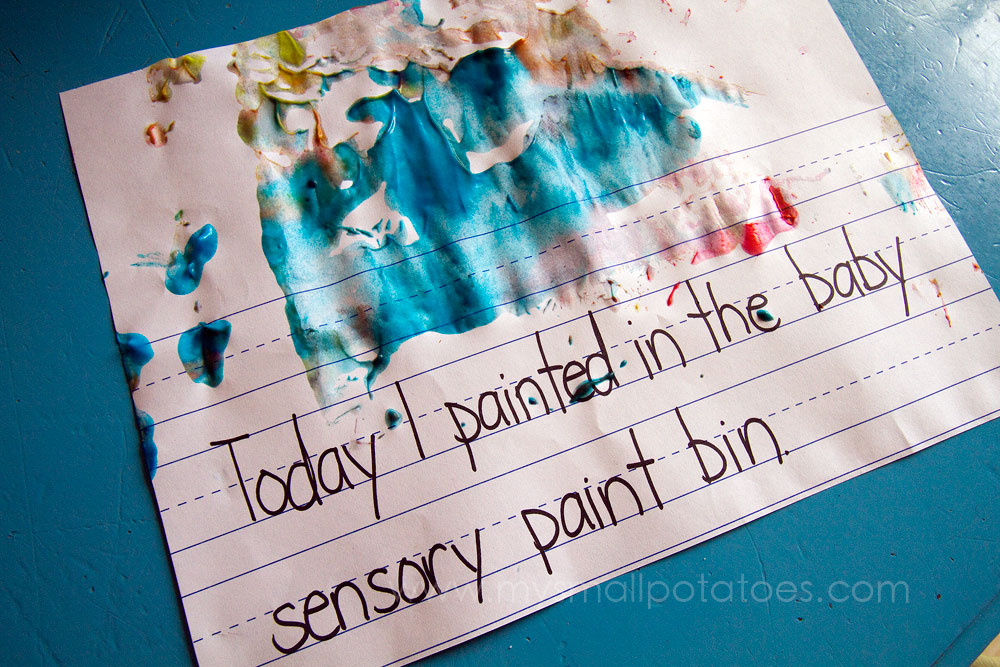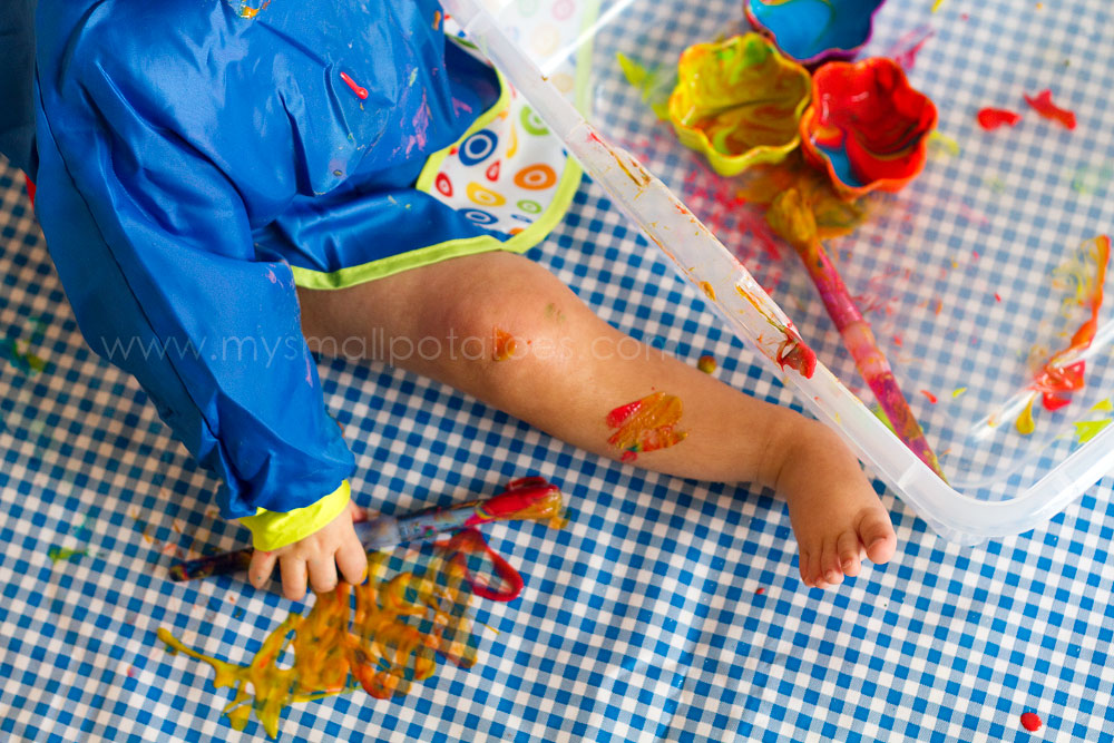 So I used a plastic tub, a splash mat, and a smock. We have sensory bins for everything else under the sun, why not for paint, too?