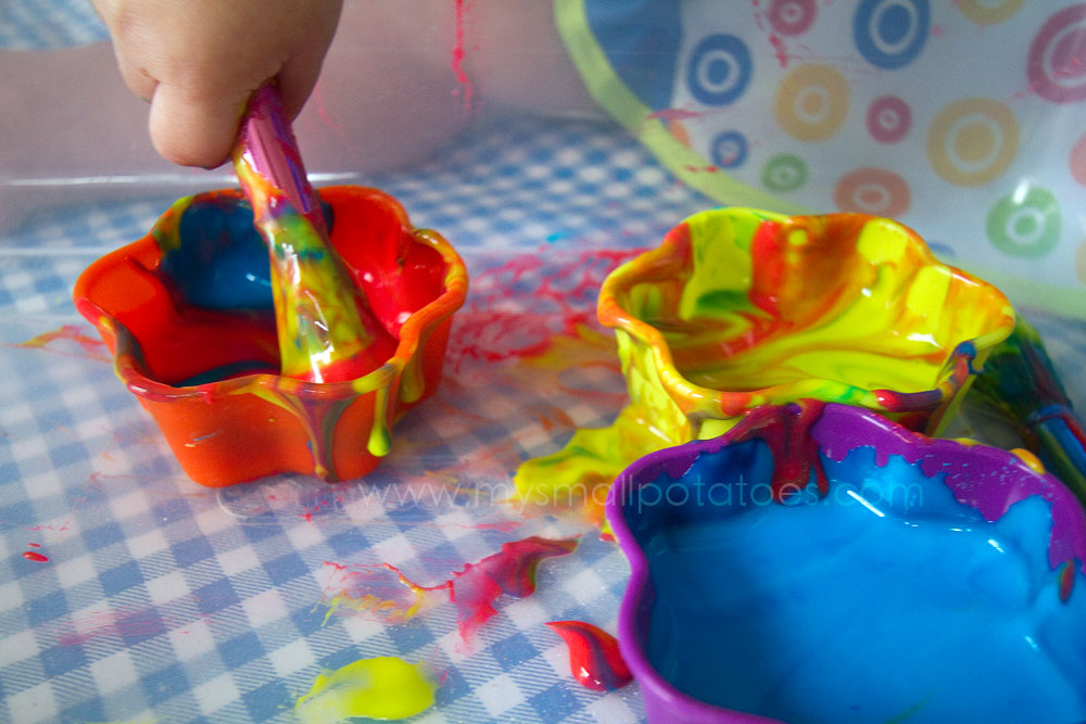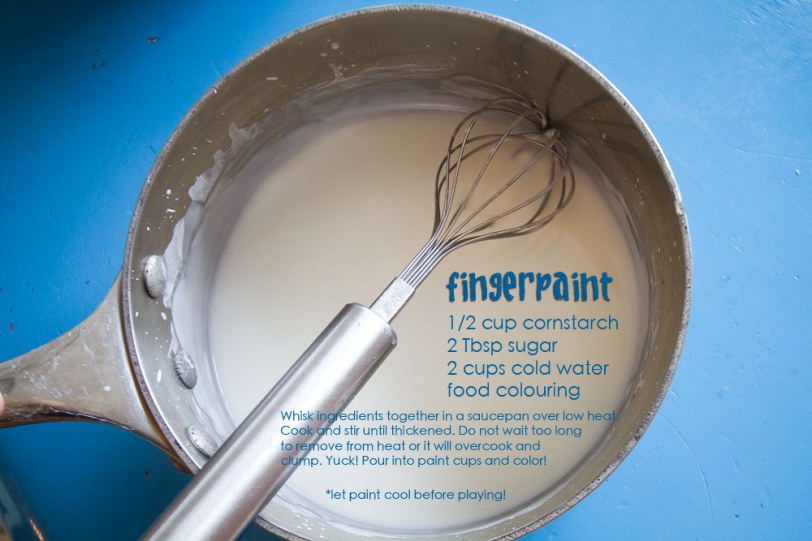 First, we need a baby-safe paint. I’m not a fan of pudding paint, simply because I’m cheap, and think it’s a waste of perfectly good milk! I prefer to make my own out of a few inexpensive ingredients from my pantry…I use silicon baking cups for baby finger painting for a couple of reasons. One, I can pour the paint into them while the paint is still hot. Secondly, babies can’t break them or crush them to oblivion if they decide to pick them up.Once the paint is coloured and mixed, it should have the consistency of runny pudding. It should not pour out like milk…When I first presented this activity to Baby J, I gave him the paint in a plastic veggie tray…I soon realized that it was hindering his exploration more than it was helping, so I removed it and he got right down to work…