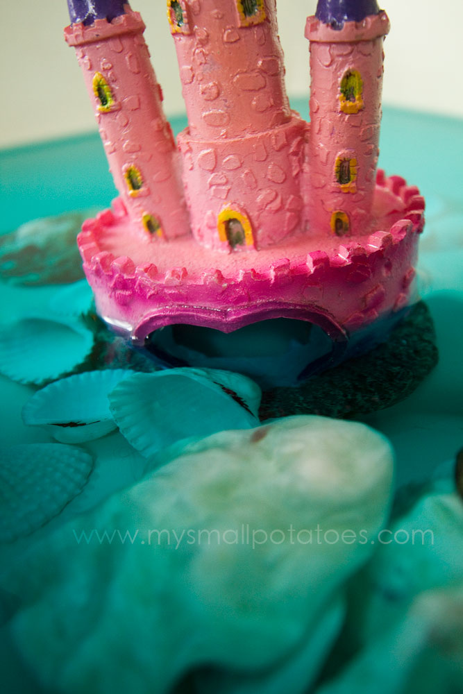 Our mermaid lagoon also needed a castle, which I found in the same pet store for $5 in the clearance section. I guess no one wanted a pink castle in their home aquariums!