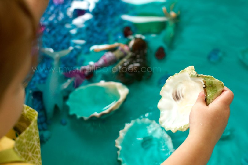 And don’t forget the mermaids! I have been collecting assorted mermaids for our sensory bin since I built it almost a year ago. I find them in McDonald Happy Meals, the dollar store, or the second-hand toy store. I have never paid more than $1 for any of them. The mermaid chair was also purchased at the second-hand toy store, Once Upon a Child.