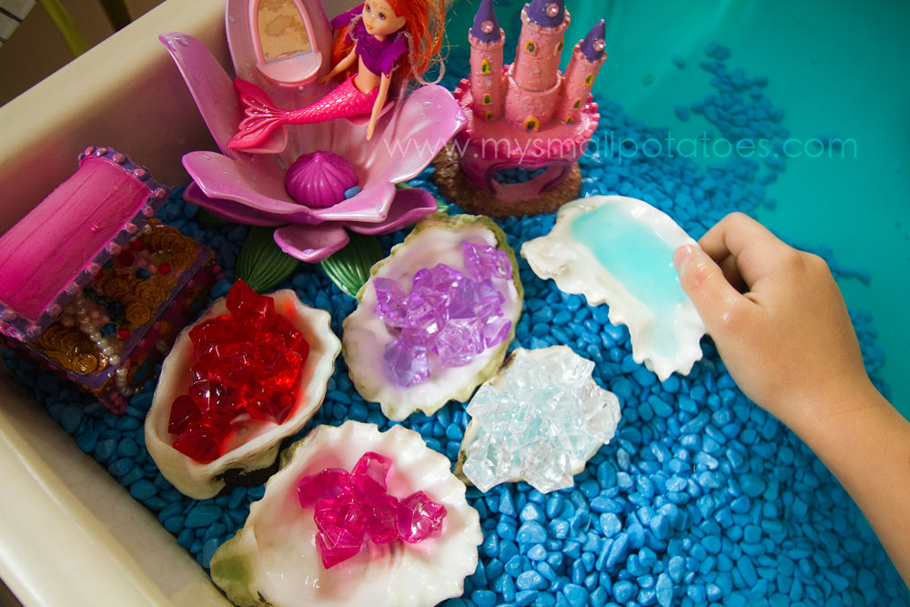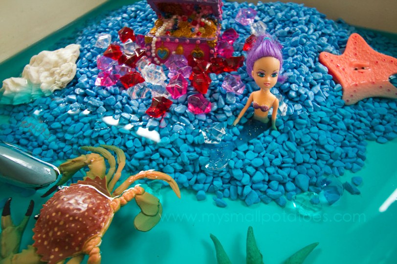 Well, today we are fixing that. We are giving the mermaids a chance to swim in actual water. And everyone who works with children of any age knows that when you add water to an activity, you add a bit of magic. It becomes a soothing, imaginary world where children can spend hours playing and creating.