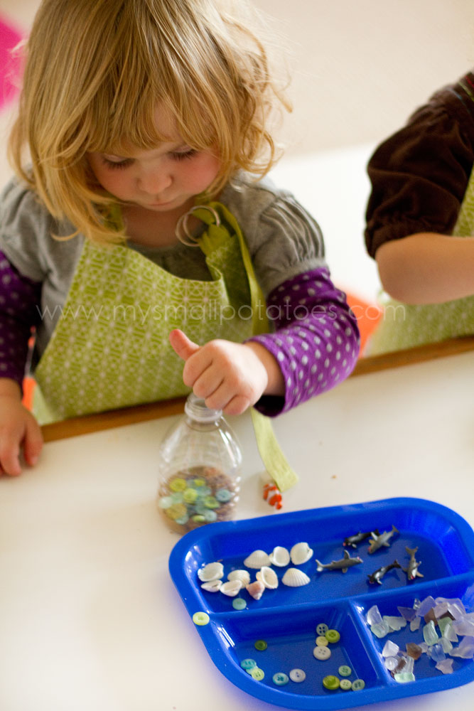 Such excellent fine-motor control practice!It was so much fun watching the little ones try to see what they had just put inside their bottles…They had to make sure their little critters and shells landed inside the bottle!