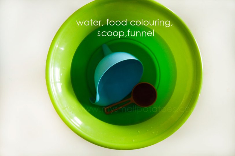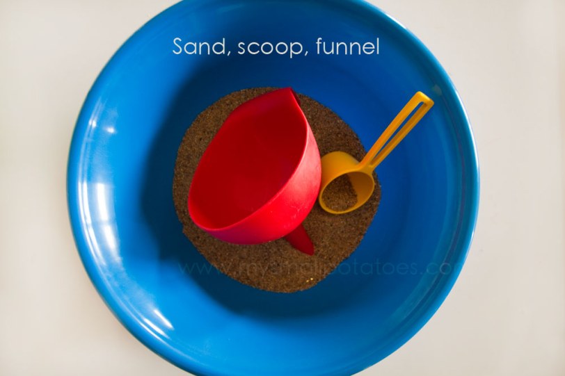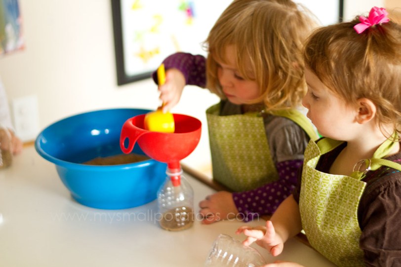 Start by having all your supplies ready. Nothing makes a 2 yr old more cranky than having to wait! You’ll need…I used clean play sand so the water would not get too murky. You will also need…The point is to have the children create their own bottle, so the proper tools are essential to avoid frustration amongst the smalls.
