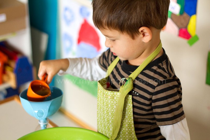 They may fill it too full, in which case they can just pour some back out into the bowl. This is an excellent opportunity to discuss the concepts “more”and “less” with toddlers.