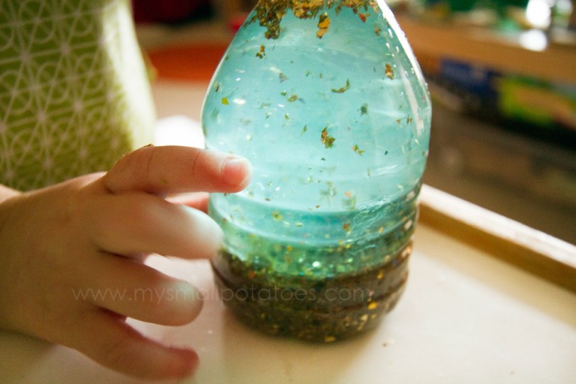 2. I love the ocean bottles! We have a mind jar which seems very boring in comparison! If you add some glycerin to the water, it will help to make the objects sink to the bottom a bit slower (and a tiny bit of liquid soap will prevent the glitter from clumping).