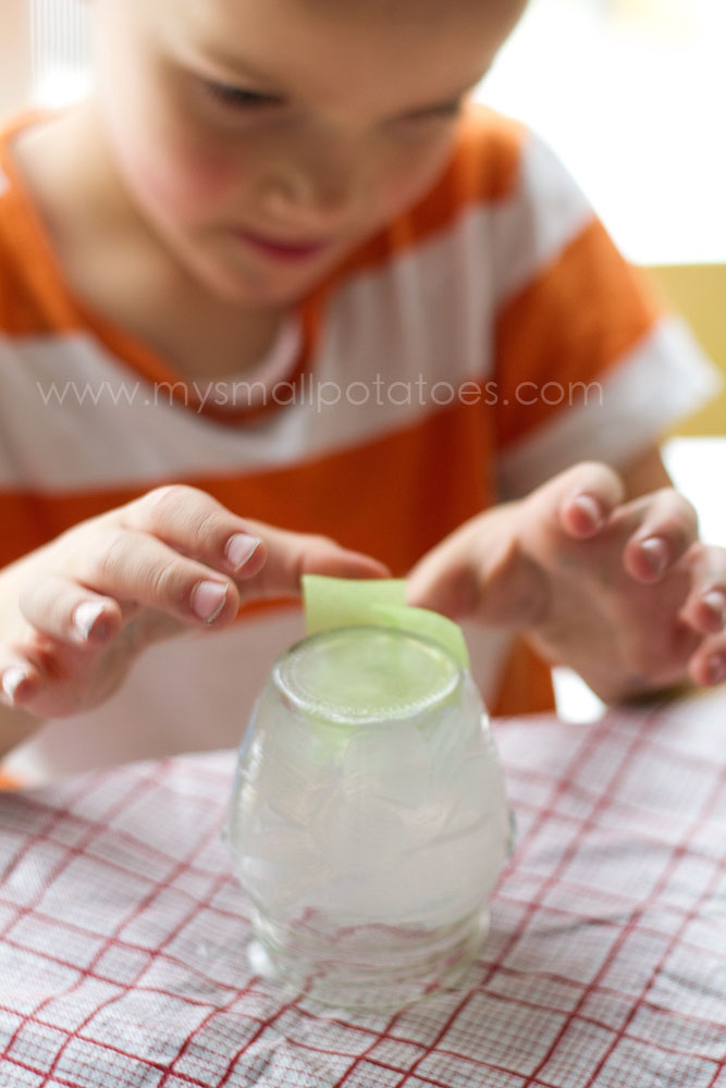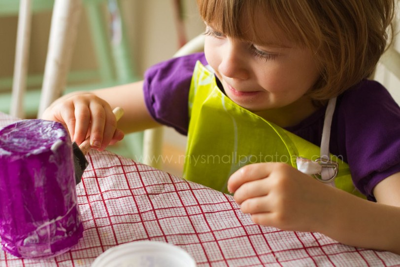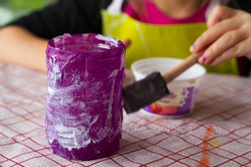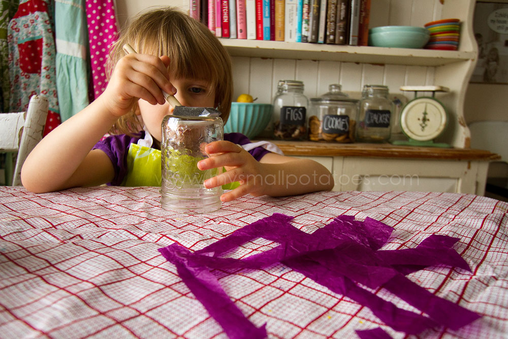 I cut coloured tissue paper into small strips and gave each child a jar, a paintbrush, and a pot of mod podge. They painted their jars with the glue. It doesn’t have to be perfect…you can let them paint at their own pace and put as much on as they think they need. This is their project, after all…