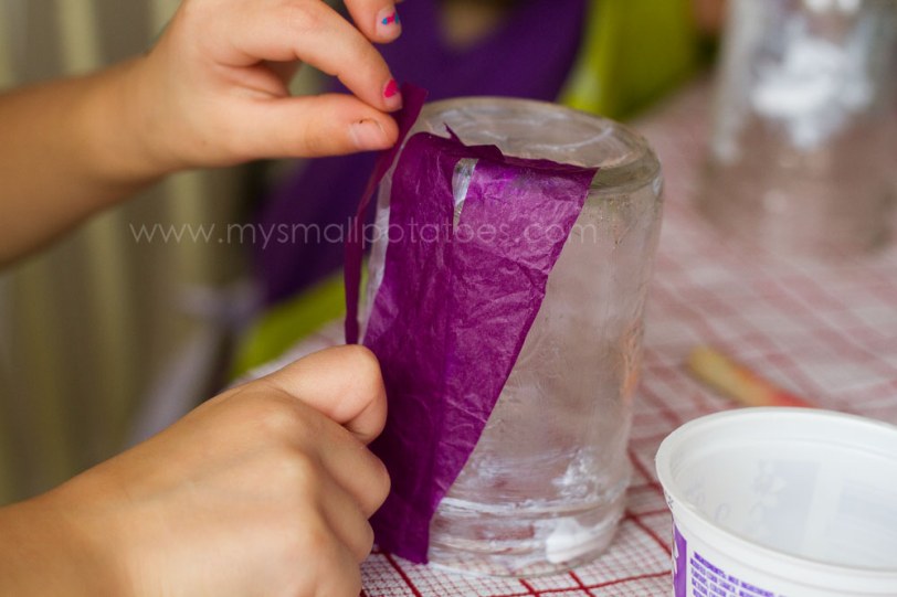 The best part of this project, is that I didn’t have to go shopping to make it happen. I keep tissue paper from gift bags that my kids receive as gifts, so I raided that stash in my storage cupboard. I always have Mod Podge on hand, and because I am always preserving fruits and veggies, I had plenty of empty jars in my garage! The battery tea lights were snagged from our Fairy’s Night Garden, but you can get them at the dollar store if you don’t have any at home already.