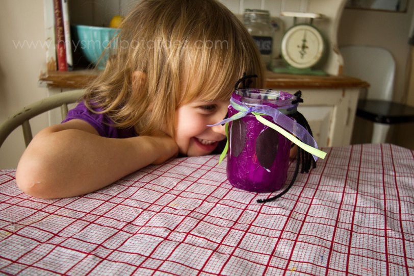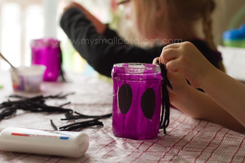 When the glue was all dried, we tied ribbon around the witch’s head and placed our battery-powered tea lights inside…The smalls were thrilled with the result! They got so excited, we took them into the laundry room to see how they glowed…