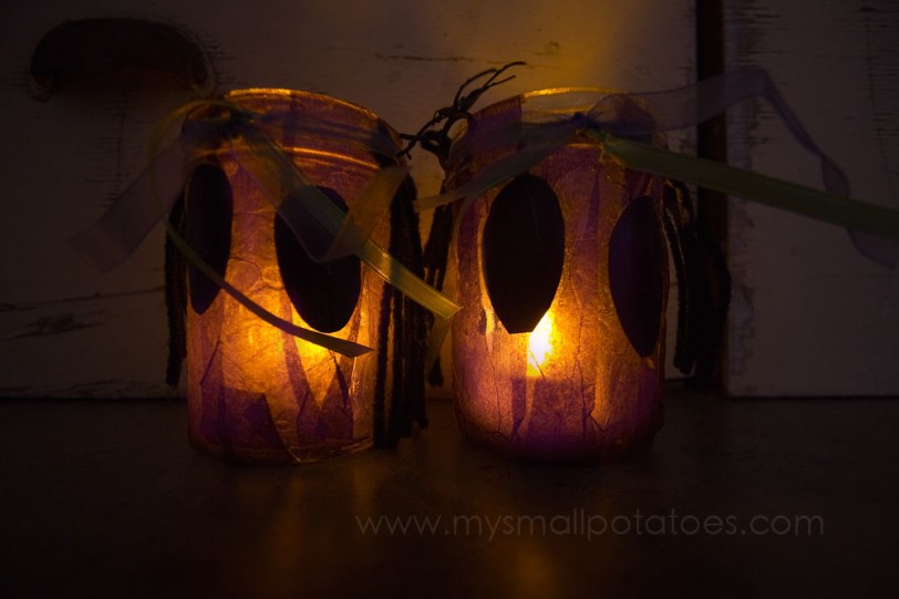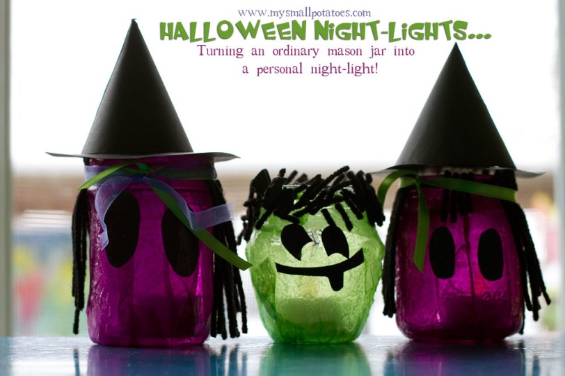 Last week, we made little Halloween night-lights for each of the smalls to keep in their rooms. I had seen many versions of these little lanterns on the internet and was enamoured by them. So cute, so festive, and when lit up, so intriguing! We made ours with battery-powered tea lights so the smalls could keep them in their rooms and not be worried about the possibility of burning the house down!