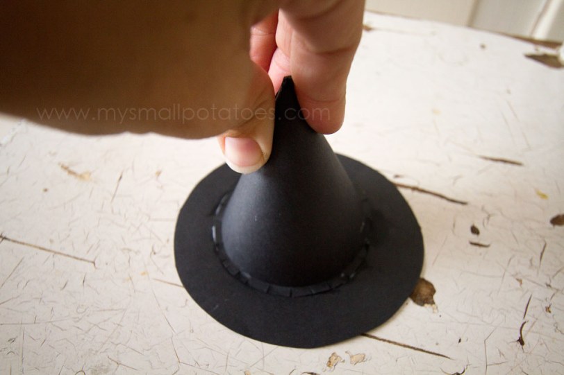 Then we decided the witches needed hats! Because we weren’t using real candles, there was nothing stopping us! I fudged my way through making the hats with a bit of black card-stock…