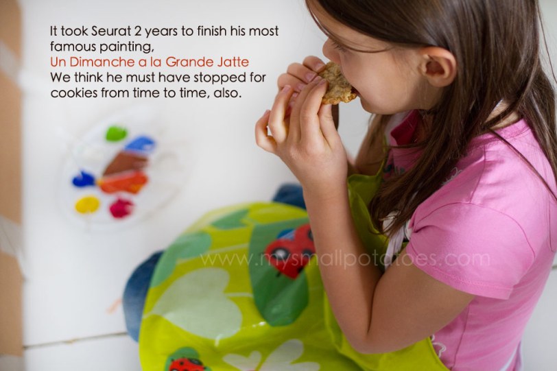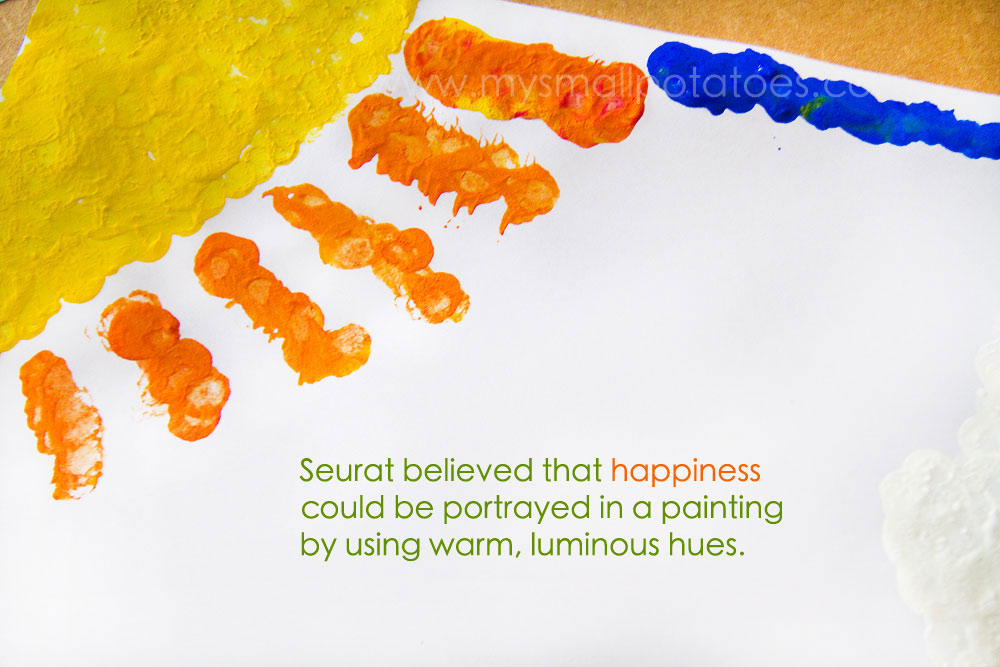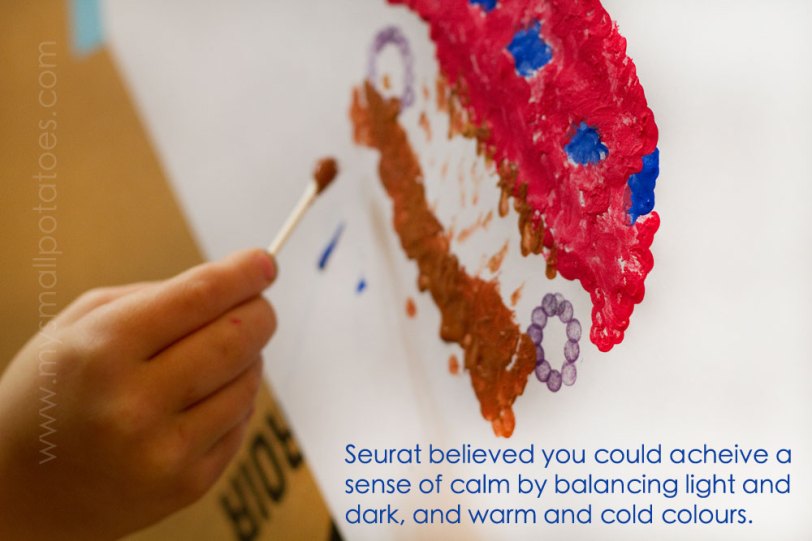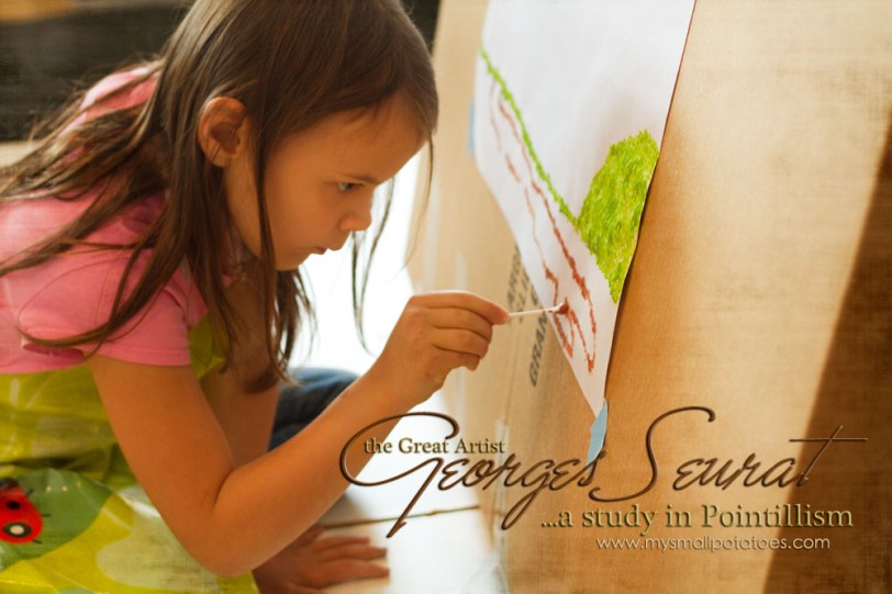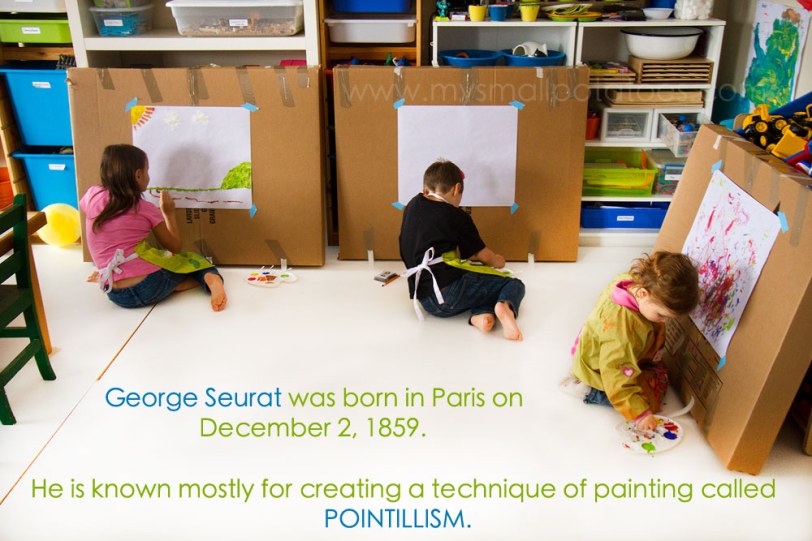 This time, they suggested Georges Seurat. Um…who’s that? Seriously, I had no idea! E said he was a Pointillist and that the smalls would be really good at it. So now I had two things to figure out…who Seurat was, and what the heck is a Pointillist?
