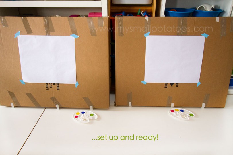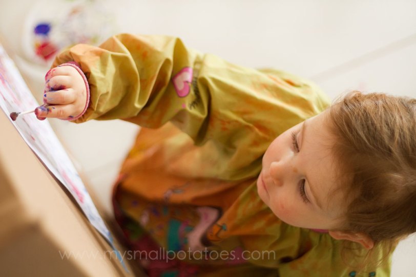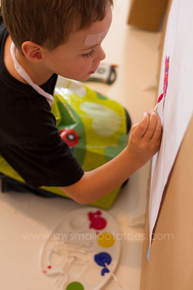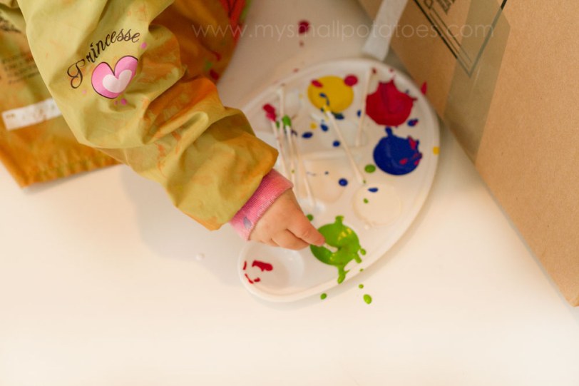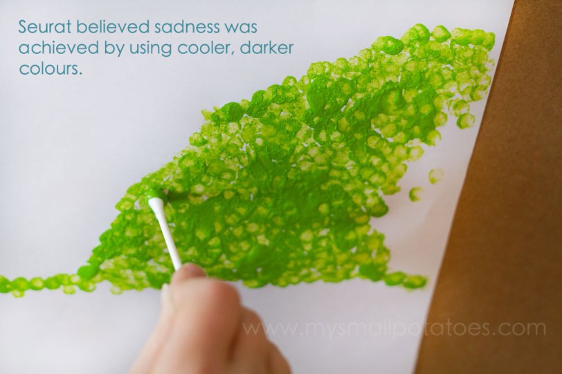 I set up make-shift easels for the smalls out of cardboard boxes. This way, each child had their own space to paint and they would have a good view of what they were trying to create with tiny dots of paint…Most Pointillists will use oil paints, as they will not run and drip down the canvas. I just used tempera paint with very little water…Each artist was supplied with bright colours on a palette with q-tips for blending and applying to their paper…They wasted no time in getting started…We talked about some of the things that Georges Seurat believed about colours and the way they could make you feel…Even our smallest Pointillist enjoyed herself at this activity…The older kids worked and worked, blending colours and giggling as they surprised themselves with a new combination!