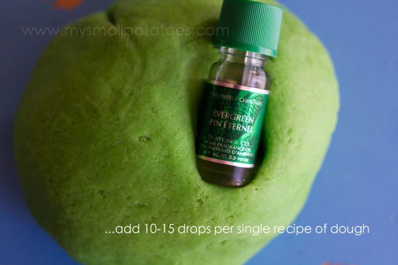 I made our favourite play dough recipe, coloured it with a LOT of green food colouring so it would be nice a vibrant, and I added evergreen essential oil to the dough while it cooked…