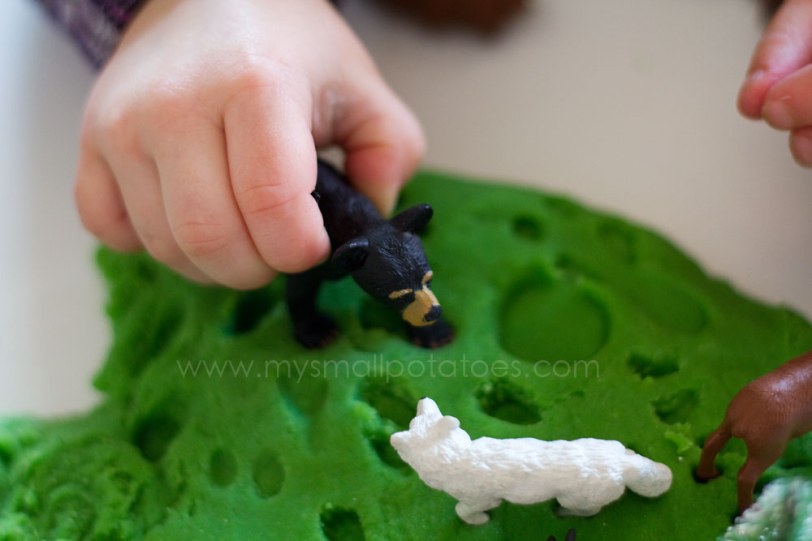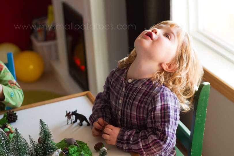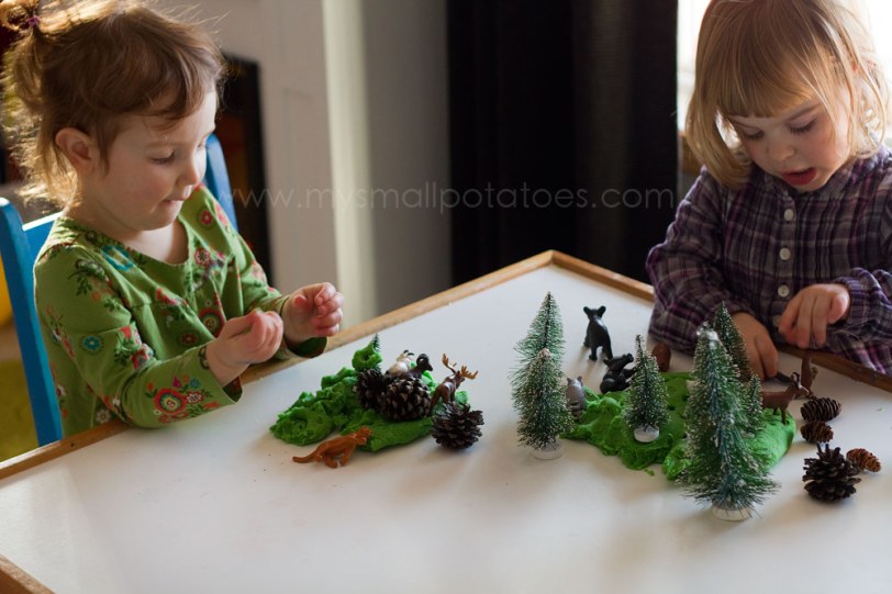 I set the play dough woodland up on the table and let the smalls do as they please with the landscape…They arranged trees and animals and played together the entire afternoon…They made animal paw prints in their play dough…They even tried to match up which animal made which print…Pine cones were filled up with the yummy, pine scented play dough…They were even used to make prints on the forest floor…As the afternoon passed, there were caves built…Cougar trails made…And mountains climbed…Oh, and the wolves. Well, they howled. And howled…The sun was setting on the day, and the smalls still didn’t want to come in from the woods…And my playroom smelled of forest. It was a perfect way to spend a long, cold afternoon.