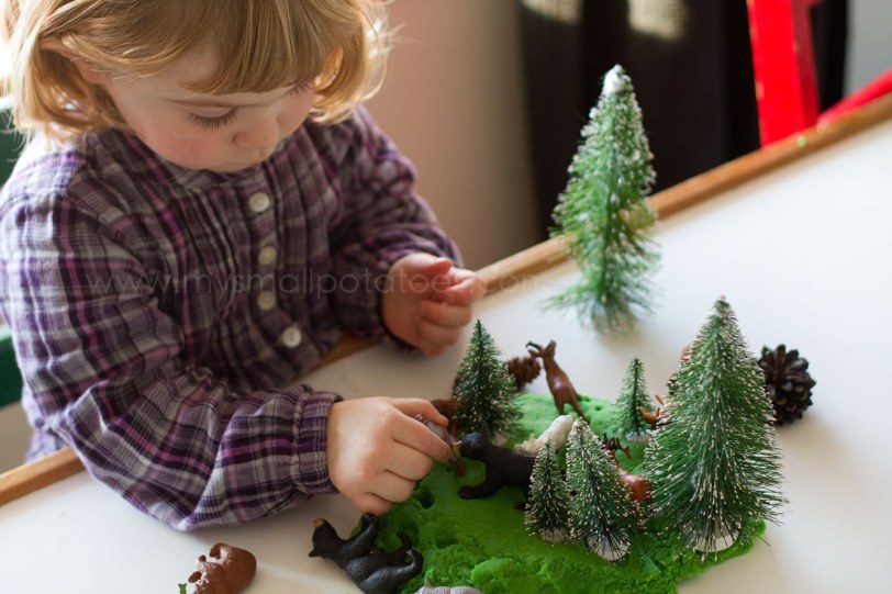 3. What a delightful little Playland! We are completely addicted to play dough here too! I’ve made play dough with the woods as inspiration too. We call it “Forest floor play dough”. It’s brown and I add rosemary to look like little pine needles. This post has me itching to make a new batch as it’s been awhile. I need some of the cute little trees and animals that you have though!