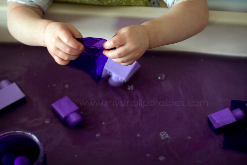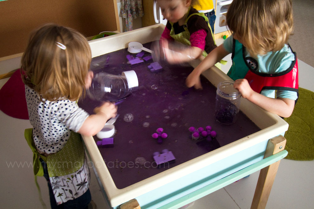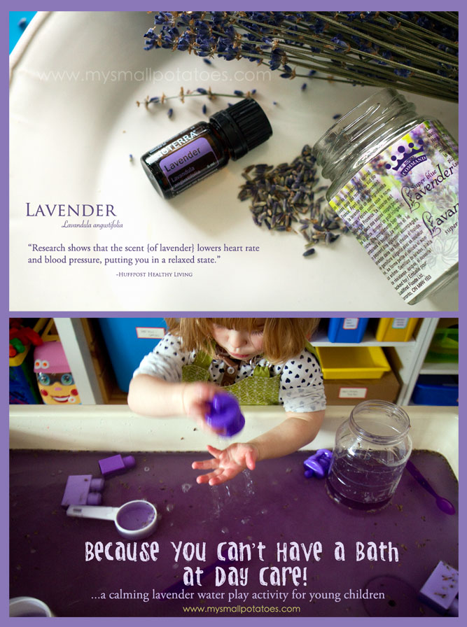 When I need calming down, my favourite place to go is straight into a hot bathtub…with my lavender soap and my lavender bath oils. I love lavender. It is the smell of relaxation and comfort.lavandulaI wanted to re-create this calming “bath time ritual” with the smalls, but you just can’t have a bath at day care. So I had to compromise. I filled the water table with warm water. I dropped about 20 drops of the lovely doTerra lavender essential oil (gifted to me by one of my lovely readers) into the water, along with drops of blue and red food colouring, and let the smalls swirls them about until the water was purple and the lavender scent was filling the air. *Please note that the pure lavender essential oil is perfectly safe if ingested…this means even the smallest smalls can play without a worry.