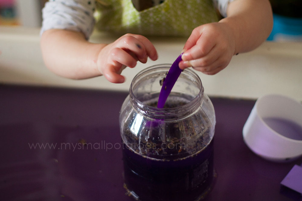 Once the water was all nice and “purply”, I gave the girls some clear plastic tubs, some scoops, a jar full of dried lavender blooms (also safe to eat), and assorted purple toys from our playroom that I thought might be interesting for the girls to experiment with, including squares of purple cellophane. These turned out to be their favourite, the sun shone through them so nicely, making them even more purple…cellophanepouringThe girls played in that water until it got cold. I added some more hot water, and they played some more.busygirls2They scooped and poured…pourandtransfersplooooshThey mixed and stirred…spoonsforstiringAnd they filled their jars right to the brim…lavendersoupfillingjarspouring2