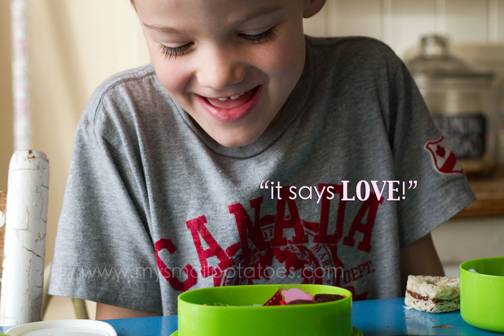 Remember last week when I made a Valentine’s bento for my littlest girl? Well, my littlest boy could not be left out of the fun, right? So I got to making one for him and surprised him with it when he came home from school yesterday.