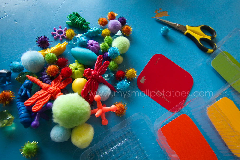 colourhuntTITLEThis busy bag is almost free of cost. We used things we already had in the house or we recycled. The only thing I purchased was the tongs…they were $1 at the Dollar Tree. I used empty food trays and cut the paint sample cards to fit. I labelled them with the written word for each colour. Our busy bags are bilingual when possible, so both the French and the English colour word is written on each paint card.  I glued the paint card down inside each plastic tray…constructionCOLOURAnd my children gathered little coloured “bits” for sorting into the trays.  They found pompoms, beads, bugs, jacks, and jewels. The only requirement I had for these “bits” was that they not be so tiny that the tongs could not pick them up.