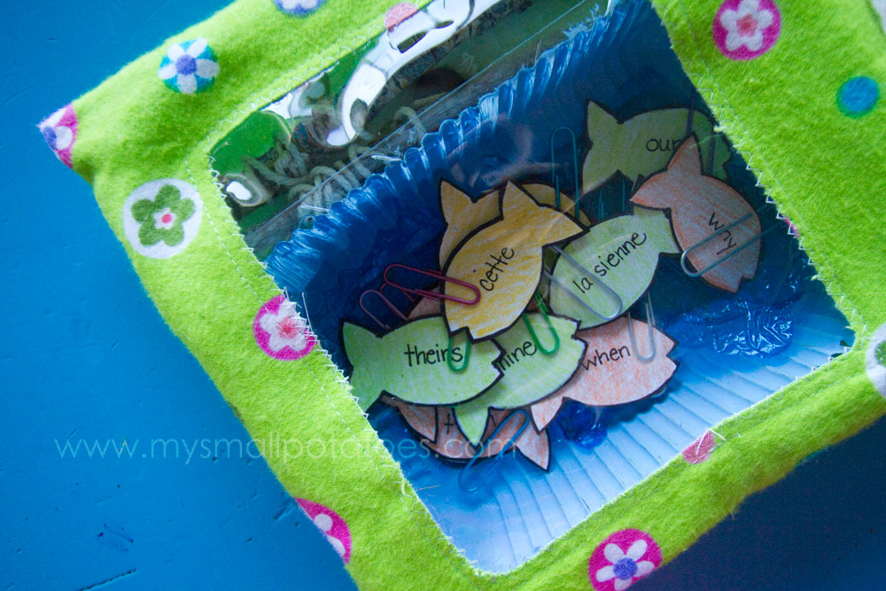 *This game is great for eye-hand coordination, letter and word recognition, and small motor practice. You could also use the names of all the children in your group on the fish to help them learn name recognition.packedup3*For the tutorial on making cloth, planet and child safe busy bags, click HERE.
