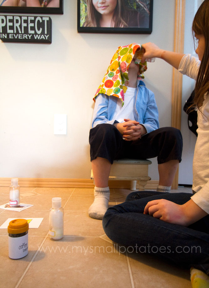 3. One player, the “smeller” covers their eyes while the other player pops the lid of a scent jar open for him to smell. If the bottle is flexible, that player can squeeze it a few times to release a stronger scent.