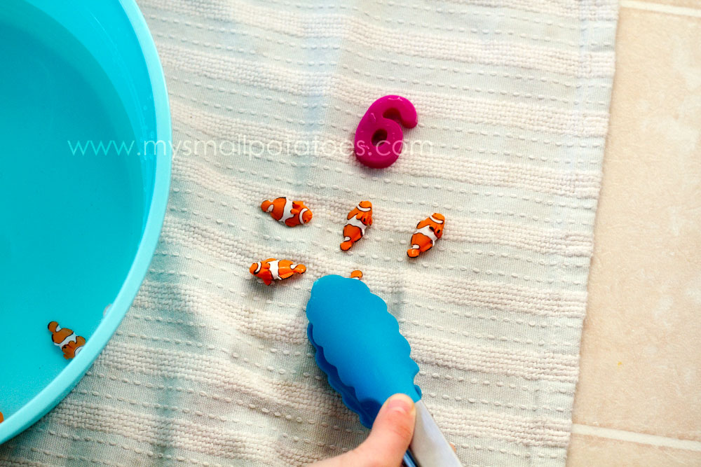 *You can use any fish you have on hand, or frogs, or shells, or whatever you like. We used the Safari Ltd. mini clownfish because they are so bright and colourful and easily distinguished from the numbers. I purchased them here at T.G.F Toys.