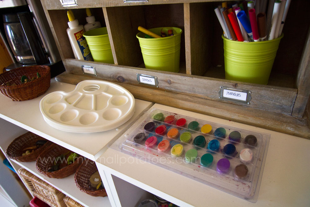 Our art centre has undergone a few changes, making more “junk” items available to the smalls for whatever project they might be working on. Glue, scissors, tape, and paint are readily accessible. We still have some plastic in our art centre but have replaced some of it with baby food jars and terracotta and metal pots. It is proving difficult to find washable, non-plastic storage bins for gluey, sticky, painty craft items…