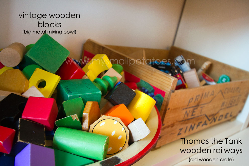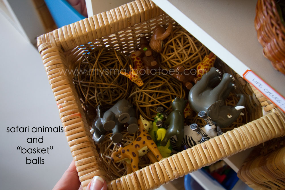 We have kept all of our manipulative toys, but have moved them into open baskets for easy reaching…plus they are really cute and the smalls can see exactly what’s inside them…
