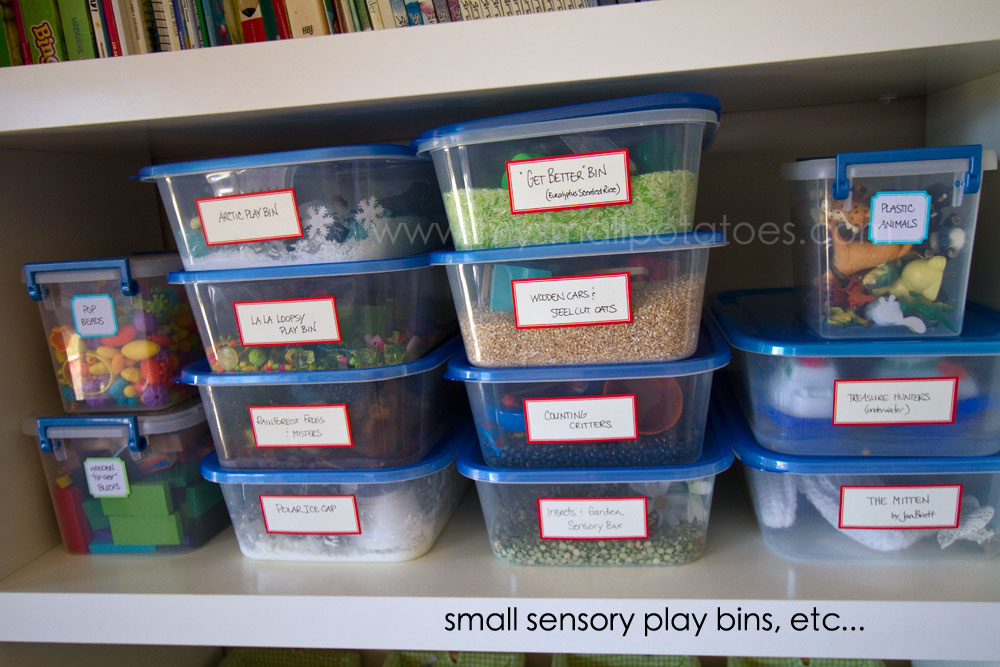 Our small sensory bins still remain in plastic bins for easy washing and keeping all the little bits tightly stored inside…
